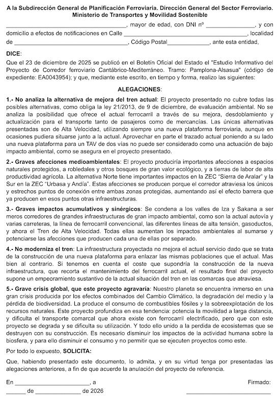 La Fundación Sustrai Erakuntza ha preparado estas alegaciones populares contra el Tren de Alta Velocidad (TAV) que pretende atravesar Iza y Sakana. Se trata de un modelo sencillo de alegación, que ponemos a disposición de personas, grupos y asociaciones de todo tipo sensibilizadas con los impactos negativos tanto sociales como medioambientales que va a provocar esta nueva infraestructura ferroviaria. Pedimos a dichos grupos que recojan la mayor cantidad posible de alegaciones, pero las personas también pueden ponerlas por su cuenta (ver abajo)…